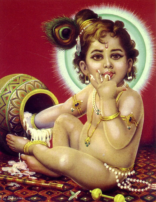 So sprachen die Gopis über ihn. Aber als sie ihn dann vor sich sahen und in sein strahlendes Gesicht schauten, freuten sie sich nur noch über seinen Anblick. Sie konnten trotz aller Beschwerden nie wirklich böse auf ihn werden und lächelten lieber über seine Taten, um glücklich zu sein.