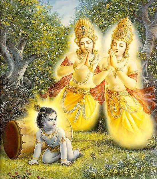 So entschied sich Krishna und bewegte sich zwischen die beiden Arjuna-Bäume, so daß sich der Mörser verklemmte. Doch der Junge zog weiter am Mörser, der an seinem Bauch angebunden war, und zwar mit so großer Kraft, daß sich die Stämme mit allen Ästen Zweigen und Blättern tief verneigten und mit einem gewaltigen Krachen zu Boden fielen. Und an der Stelle der beiden Bäume erschienen zwei strahlende Personen, die wie ein loderndes Feuer alles ringsherum erleuchteten.