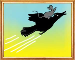 Hiranyaka sagte: „Wenn dem so ist, so werde auch ich mit dir gehen, denn auch ich habe großes Leid.“ Die Krähe fragte: „Hm! Was hast du für Leid?“ Hiranyaka antwortete: „Ach! Das ist eine lange Geschichte. Was das betrifft, so will ich dir alles ausführlich erzählen, wenn wir dort angekommen sind.“ Die Krähe sagte: „Ich bin aber doch ein Flugtier, und du gehst auf der Erde: Wie kannst du nun mit mir gehen?“ Jener antwortete: „Wenn du den Willen hast, mein Leben zu retten, so kannst du mich dahin bringen, indem du mich deinen Rücken besteigen läßt. Auf andere Weise kann mir nicht geholfen werden.“ Nachdem sie dies gehört, sprach die Krähe voller Freude: „Wenn du so meinst, so bin ich selig, daß ich dort mein Leben auch mit dir werde zubringen können. Ich kenne die mit dem Zusammenflug beginnenden acht Arten des Fluges. Es heißt ja: Zusammenflug und auch Vorflug, großer Flug und auch Niederflug, das Rad, der Querflug und Hochflug, und als achter der leichte Flug (siehe auch MHB 8.41). - Darum besteige meinen Rücken, damit ich dich mit Leichtigkeit zu diesem Teich bringe.“ Darauf stieg Hiranyaka augenblicklich auf ihn. Er aber machte sich mit ihm auf den Weg, indem er nach der Weise flog, welche man „Zusammenflug“ nennt. So bewegte er sich gemach mit ihm vorwärts zu diesem Teich.