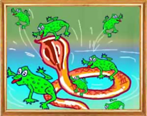 Von jenem wurde dies nun allen Fröschen kundgetan. Drauf gingen sie alle zusammen hin und meldeten es dem Froschkönig Jalapada („der Wasserfüßige“). Dieser dachte „Das ist ja wunderbar!“ und verließ eilig, von seinen Ministern umgeben, den Teich und bestieg den Rücken der Schlange Mandavisha. Auch die übrigen stiegen alle nach ihrer Rangordnung auf ihren Rücken. Um es kurz zu machen: Diejenigen, die keinen Platz auf ihr erlangen konnten, liefen hinter ihr her. Mandavisha aber zeigte zu seinem eigenen Vergnügen verschiedenförmige Gangarten. Jalapada nun, der durch die Berührung des Schlangenkörpers Freude empfand, sagte zu ihr: Nicht das Reiten auf Elefanten, nicht auf Rossen, Wagen oder Männern gefällt mir so, wie das hier auf Mandavisha.