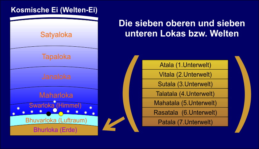 Oh Bester Kenner des Brahman, wenn die Elemente, die Sinnesorgane, das Denken und die drei natürlichen Qualitäten nicht miteinander verbunden wären, könnten sie kein körperliches Wesen bilden. Doch durch die Energie des Höchsten Herrn sind sie miteinander verbunden, und dadurch kann dieses ganze Weltall aus Wahrheit und Illusion entstehen. Nachdem das Welten-Ei tausend Jahre (gleich tausend Mahayugas) im subtilen Wasser-Element versunken war, belebte (bzw. gebar) die Seele als Herr des Lebens durch Zeit, Karma und Natur das Welten-Ei wieder. Dann zerteilte sich das Welten-Ei, und der Höchste Geist (Purusha) verkörperte sich mit tausenden Augen, Mündern, Köpfen, Armen und Beinen. Die Weisen wissen, daß sich alle Welten im Körper dieses Höchsten Geistes befinden, nämlich die sieben Unterwelten unterhalb seiner Hüfte und die sieben oberen Welten darüber. Die Brahmanen sind die Münder dieses Höchsten Geistes, die Kshatriyas seine Arme, die Vaisyas seine Schenkel und die Shudras seine Füße. Die Erde (Bhurloka) besteht in seinen Beinen, der Luftraum (Bhuvarloka) im Bereich seines Nabels, der Himmel (Swarloka) in seiner Herzgegend, der Maharloka in seiner Brust, der Janaloka in seinem Hals, der Tapaloka in seinem Mund und der Satyaloka in seinem Kopf, der auch als der ewige Brahmaloka bezeichnet wird. In der Hüfte besteht die Unterwelt Atala, in den Oberschenkeln Vitala, in den Knien Sutala, in den Waden Talatala, in den Knöcheln Mahatala, in den Füßen Rasatala und in den Fußsohlen Patala (die sieben Unterwelten werden in Kapitel 5.24 noch ausführlich beschrieben). Auf diese Weise bestehen alle Welten im Körper des Höchsten Geistes (des Purusha). Man kann auch sagen, seine Beine sind die Erde (Bhurloka), sein Bauch ist der Luftraum (Bhuvarloka), und bis zu seinem Kopf sind die himmlischen Welten (ab Swarloka).