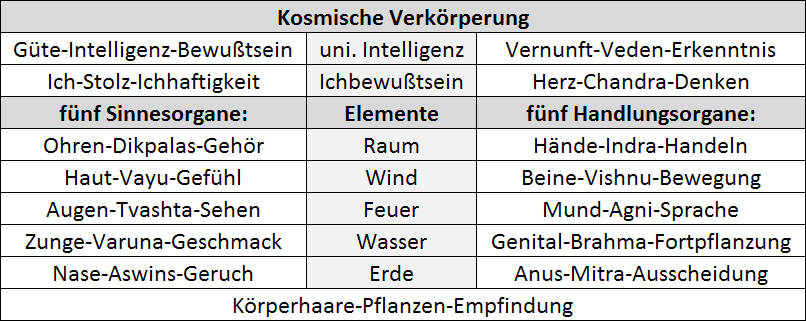 Er verkörperte seinen Mund für Agni, den führenden Gott des Feuers, mit der Kraft der Sprache, mit der die Wesen sprechen können. Dann entstand sein Gaumen (bzw. seine Zunge) für Varuna, den führenden Gott des Wassers, mit der Kraft des Geschmacks, damit die Wesen alles Flüssige schmecken können. Er verkörperte die Nasenlöcher für die Aswin-Zwillinge mit der Kraft des Geruchs, damit die Wesen riechen können. Er verkörperte die Augen für Tvashta (den führenden Gott der Sonne) mit der Leucht- und Sehkraft, womit man alle Formen sehen kann. Er verkörperte seine Haut für den führenden Gott des Windes (Vayu) mit der Kraft des Gefühls, mit der die Wesen fühlen können. Er verkörperte seine Ohren für die führenden Götter des Raumes (bzw. der Himmelsrichtungen, die Dikpalas) mit der Kraft des Hörens, damit die Wesen den Klang wahrnehmen können. Er verkörperte die Körperhaare auf der Haut für den führenden Gott der Pflanzen mit der Kraft der Empfindung, womit die Wesen gereizt werden. Er verkörperte sein Genital für Prajapati (bzw. Brahma), den führenden Gott der Schöpfung, mit der Kraft der Fortpflanzung, mit der sich die Wesen (an ihrer Nachkommenschaft) erfreuen können. Er verkörperte seinen Anus für den führenden Gott Mitra mit der Kraft der Ausscheidung, womit die Wesen (alles Verdaute) ausscheiden können. Er verkörperte seine Hände für Indra, den führenden Gott im Himmel, mit der Kraft des Handelns, damit die Wesen in der Welt tätig werden können. Er verkörperte seine Beine für Vishnu, den führenden Gott der Erhaltung, mit der Kraft der Bewegung, womit die Wesen ihre Ziele erreichen. Er verkörperte seine Vernunft für den Gott des Wortes (bzw. der Veden) mit der Kraft der höheren Erkenntnis, womit man alles durchschauen kann. Er verkörperte sein Herz für Chandra, den Gott des Mondes, mit der Kraft des Denkens, damit die Wesen Entscheidungen fällen können. Er verkörperte sein kosmisches Ich für den Gott des Stolzes (Rudra) mit der Kraft des karmischen (bzw. ichbewußten) Handelns, womit die Wesen ihre Taten persönlich ansammeln. Und er verkörperte seine wahrhafte Güte (Sattwa) für den Gott der universalen Intelligenz mit der Kraft des Bewußtseins, mit der die Wesen wahrnehmen können.