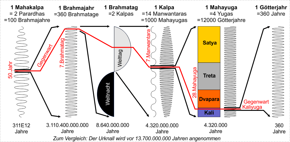 Die vier Yugas (Zeitalter) nennt man Krita, Treta, Dwapara und Kali. Die Gesamtlänge dieses Zyklus wurde auf 12.000 Götterjahre berechnet (ein Götterjahr sind 360 Menschenjahre, also insgesamt 4.320.000 Menschenjahre). Die Länge der jeweiligen Yugas sind mit Krita beginnend jeweils ein-, zwei-, drei- und viertausend Götterjahre mit den jeweiligen Übergangszeiten (am Anfang und Ende) von ein-, zwei-, drei- und vierhundert Götterjahren. Die Zeit zwischen den Übergangszeiten nennen die Gelehrten das herrschende Zeitalter, wobei jedes Zeitalter andere Eigenschaften an Tugend und Gerechtigkeit besitzt. Nur im goldenen Krita-Yuga ist das Dharma der Tugend und Gerechtigkeit vollkommen, und in jedem weiteren Zeitalter geht davon ein Viertel verloren. Eintausend solcher Zyklen aus vier Yugas (sogenannte Mahayugas) bilden einen Tag von Brahma für die drei Welten (also ein Kalpa bzw. Schöpfungstag mit 4.320.000.000 Menschenjahren). Danach folgt mit gleicher Länge eine Nacht (die zyklische Auflösung), in welcher der Schöpfer schläft. Und wenn die Nacht vorübergeht, beginnt für die drei Welten (von Himmel, Luftraum und Erde) ein neuer Schöpfungstag von Brahma. An jedem Schöpfungstag herrschen 14 Manus (die Stammväter der Menschheit) über jeweils etwas mehr als 71 Mahayugas. Die Zeit ihrer Herrschaft wird Manwantara genannt, und damit entstehen gleichzeitig mit dem Manu und seinen Nachkommen die Sieben Heiligen und die Götter-Klassen mit ihrem Götterkönig Indra. So beschreibt man einen Schöpfungstag von Brahma, an dem die Pflanzen, Tiere und Menschen sowie die Ahnen und Götterwesen in den drei Welten durch ihr angesammeltes Karma entstehen und leben. In jedem Manu und seinen Nachkommen verkörpert der Höchste Herr die Qualität der Güte, um die Welt zu erhalten und den Höchsten Geist zu erkennen. Und am Ende des Schöpfungstages nimmt er die Qualität der Trägheit an, zeigt seine Macht in Form der vergänglichen Zeit und zieht alle Wesen in seine Stille zurück. Alle Geschöpfe verschwinden, Sonne und Mond erlöschen, und die drei Welten (von Erde, Luftraum und Himmel) versinken in nächtlicher Dunkelheit. Wenn die drei Welten im Feuer der Auflösung verbrennen, das aus der Kraft von Sankarshana (der Urschlange) erscheint, verlassen die Heiligen wie Bhrigu usw. von der Hitze gedrängt die Welt des Maharloka (oberhalb der drei Welten) und erheben sich zum Janaloka. Nach diesem Feuer der Auflösung erheben sich vom Wind getrieben die Wellen des (feinstofflichen) Wassers und überfluten augenblicklich die drei Welten, so daß alles untergeht. Und in diesem Wasser ruht dann der Höchste Herr auf dem Bett von Ananta (der Urschlange) im Yoga-Schlaf mit geschlossenen Augen und gepriesen von den Bewohnern des Janalokas.