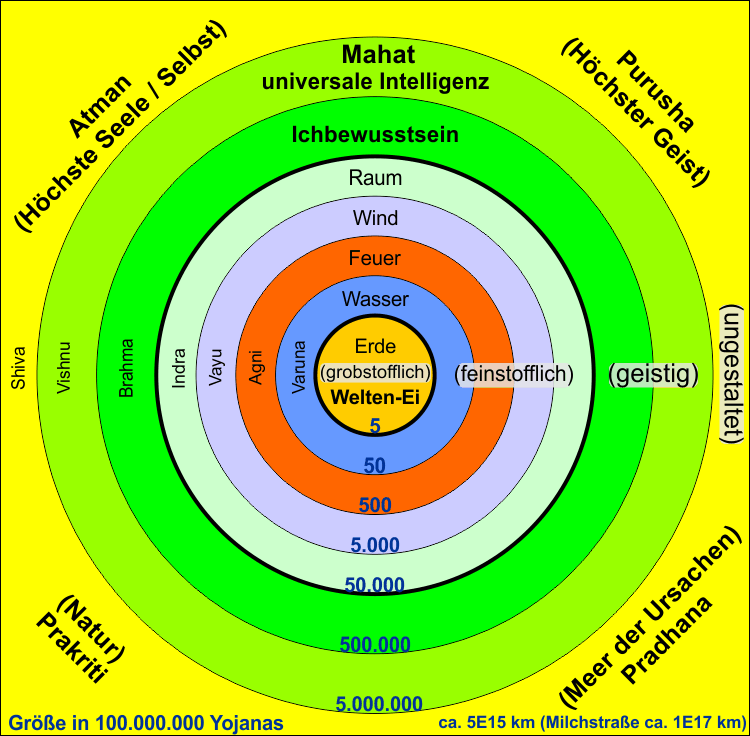 Für die anfangslose, grenzenlose und unvergängliche Seele des Universums ist diese Lebenszeit von Brahma nur ein winziger Augenblick. Die Zeit vom kleinsten Tick bis zur Lebenszeit von Brahma ist allmächtig und allgegenwärtig, aber kann in keiner Weise den Höchsten Herrn beherrschen, sondern nur die individuellen Seelen, die sich mit ihrer Körperlichkeit identifizieren. Dieses Welten-Ei von Brahma, das aus der Durchdringung und Umwandlung der natürlichen Prinzipien entstanden und von ihnen umhüllt ist, breitet sich 500.000.000 Yojanas aus. Jede umgebende Schicht ist zehnmal größer. Und wie das Welten-Ei aus vielen kleinen Teilchen (Paramanus) besteht, so existieren auch Millionen solcher Brahma-Welten-Eier im Universum. Man sagt, die Ursache aller Ursachen dafür ist die höchste Wahrheit, der Höchste Geist (Purusha), der sich in der universalen Intelligenz von Vishnu verkörpert.