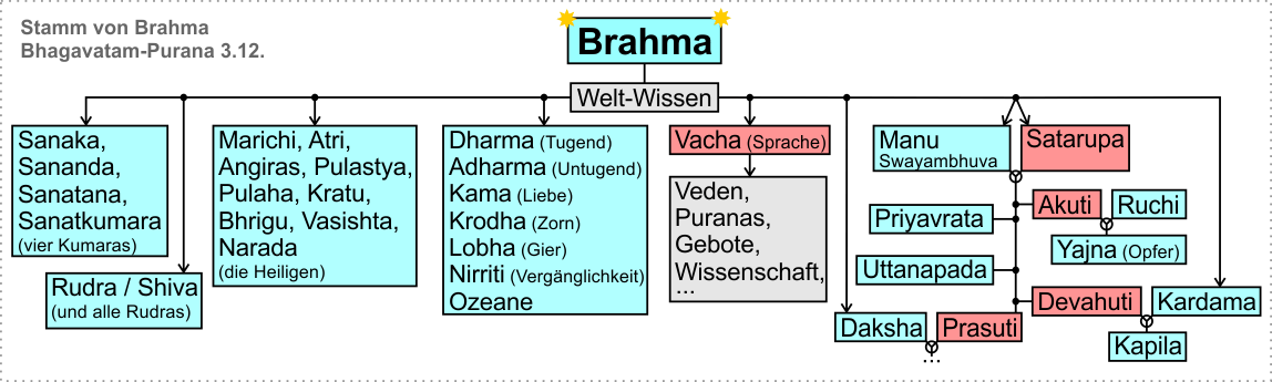 Doch nun geschah es, oh Vidura, daß sich der Selbstgeborene leidenschaftlich in seine bezaubernde Tochter Vacha (die „Sprache“, auch Sarasvati, die Göttin des Lernens) verliebte, die aber diese Leidenschaft nicht erwiderte. Und als seine heiligen Söhne mit Marichi an der Spitze sahen, wie ihr Großer Vater sein Herz auf diese Untugend richtete, sprachen sie mit gebührendem Respekt zu ihm: