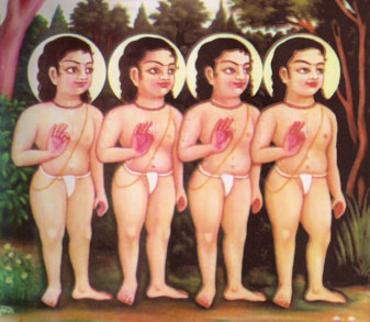 Zuerst erschuf er das weltliche Wissen von Hell und Dunkel (bzw. Tag und Nacht oder Leben und Tod), die kleine und große Verwirrung des Geistes (wie geistige und sinnliche Liebe) und die Trägheit der Erkenntnis (des wahren Selbst). Doch als er das Unheil dieser Schöpfung sah, konnte er sich darüber nicht freuen und versuchte, seinen Geist durch Meditation über den Höchsten Herrn zu reinigen, bis er den Geist für eine andere Schöpfung fand. Damit erschuf der Selbstgeborene die Heiligen Sanaka, Sananda, Sanatana und Sanatkumara (die vier Kumaras). Aber sie entsagten jedem weltlichen Handeln und zeugten keine Nachkommen. Da sprach der Selbstgeborene zu den geistigen Söhnen: „Oh meine Söhne, seid fruchtbar und vermehrt euch!“ Doch mit dem Ziel der höchsten Befreiung waren sie allein Vasudeva gewidmet.