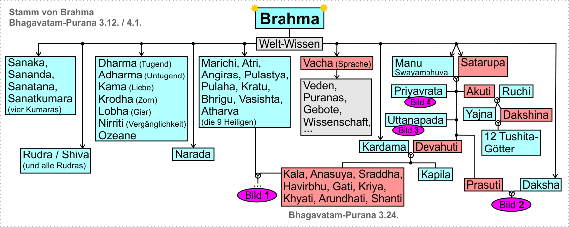 Oh Vidura, über Devahuti, die der Manu in die Ehe mit Kardama gab, habe ich dir bereits alles erzählt (ab Kapitel 3.22). Die Tochter Prasuti gab der Swayambhuva Manu in die Ehe mit Daksha, dem geistigen Sohn von Brahma, und ihre Nachkommen breiteten sich in allen drei Welten aus.