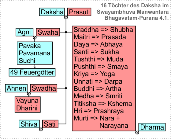 Swaha (der Opferspruch für die Götter), eine weitere Tochter von Daksha, wurde mit Agni verheiratet und gebar ihm die drei Söhne Pavaka, Pavamana und Suchi, die sich von Opfergaben ernähren. Sie zeugten ihrerseits noch weitere 45 Feuergötter, so daß es mit Vätern und Großvater insgesamt 49 Feuergötter gibt. Sie bilden die göttlichen Wesen des Feuers, unter deren Namen die Kenner des Brahmans während der vedischen Rituale ihre Opfergaben dem Feuergott übergeben.