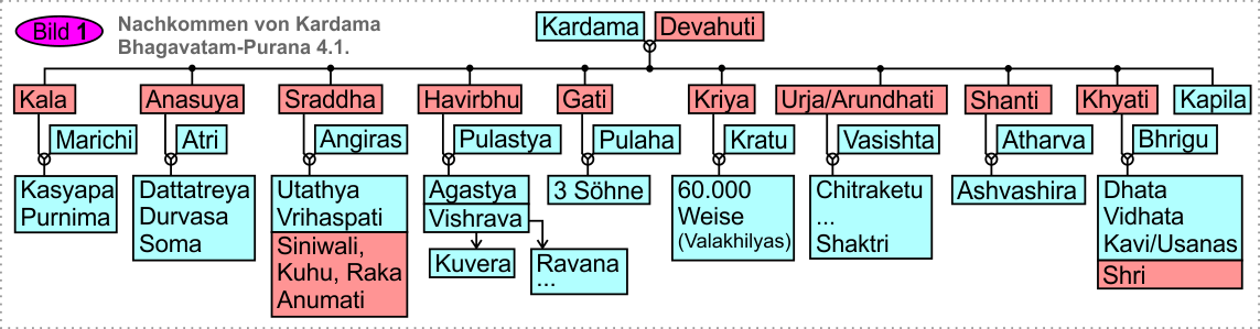 Havirbhu („opfergeboren“), die vierte Tochter von Kardama, wurde zur Ehefrau von Pulastya und gebar ihm zwei Söhne, nämlich Agastya als Verkörperung des Verdauungsfeuers (Dahra-Agni) und den asketischen Vishravas. Der Sohn von Vishrava mit seiner Ehefrau Idavida (bzw. Ilavila) wurde Kuvera, der Gott des Reichtums. Und seine zweite Frau (Kaikasi) gebar ihm die Söhne Ravana, Kumbhakarna und Vibhishan (die im Ramayana eine große Rolle spielen).