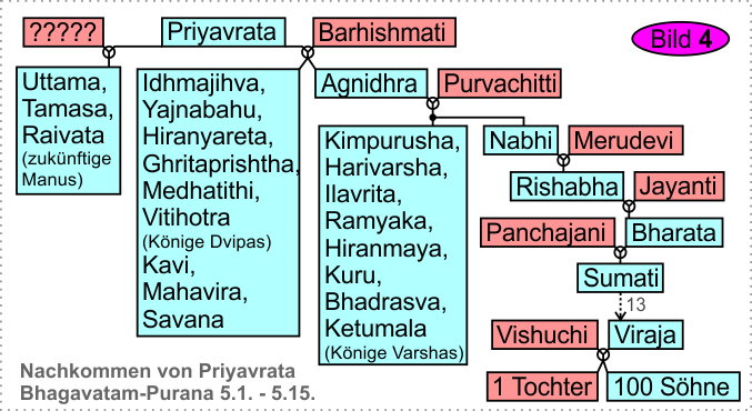 Sumati, der Sohn von Bharata, folgte dem Weg seines Großvaters Rishabha, und wurde (später) im Kali-Zeitalter von verschiedenen Heuchlern entgegen dem Sinn der Veden zu einem Gott gemacht. Seine Ehefrau Vriddhasena gebar ihm einen Sohn namens Devatajit. Devatajit heiratete Asuri und zeugte mit ihr den Sohn Devadyumna. Devadyumna zeugte mit Dhenumati den Sohn Parameshthin. Und Parameshthin zeugte mit Suvarchala den Sohn Pratiha, der durch Erkenntnis die Selbstverwirklichung erreichte, sein Bewußtsein reinigte und sich beständig an den Großen Geist (Maha-Purusha) erinnerte. Pratiha heiratete ebenfalls eine Frau namens Suvarchala und zeugte mit ihr die drei Söhne Pratiharta, Prastota und Udgata. Pratiharta zeugte mit Stuti die beiden Söhne Aja und Bhuma. Bhuma zeugte mit Rishikulya den Sohn Udgitha. Udgitha zeugte mit Devakula den Sohn Prastava. Prastava zeugte mit Niyutsa den Sohn Vibhu. Und Vibhu zeugte mit Rati den Sohn Prithushena. Der Sohn von Prithushena mit seiner Frau Akuti hieß Nakta, und der Sohn von Nakta und Druti hieß Gaya. Gaya wurde ein höchst erhabener weiser König, der für seine Frömmigkeit weit berühmt war. Man erkannte ihn durch seine Qualitäten als direkte Verkörperung von Vishnu, dem Höchsten Herrn, der zum Schutz der ganzen Welt geboren wurde. Er wurde von reiner Güte bewegt und wirkte in der Gesellschaft als Großer Geist (Maha-Purusha). Er erfüllte seine Aufgabe im Leben, beschützte sein Volk, gewährte ihnen viel Wohlergehen, behandelte sie wie seine eigenen Kinder und bestrafte jene, die Strafe verdienten. Er widmete alle Gebote, Riten und Opfer dem Höchsten Herrn und Höchsten Geist, der die Quelle aller Geschöpfe und des Lebens ist und dem Höchsten Brahman entspricht. Durch seine Hingabe, seine geistigen Qualitäten und seinen Dienst, den er den Lotusfüßen der Hochbeseelten widmete, reinigte er sein Bewußtsein, beendete die körperliche Anhaftung, verwirklichte Selbsterkenntnis und erreichte das Höchste. Damit regierte er die Welt ohne Egoismus nach den heiligen Geboten der Veden.