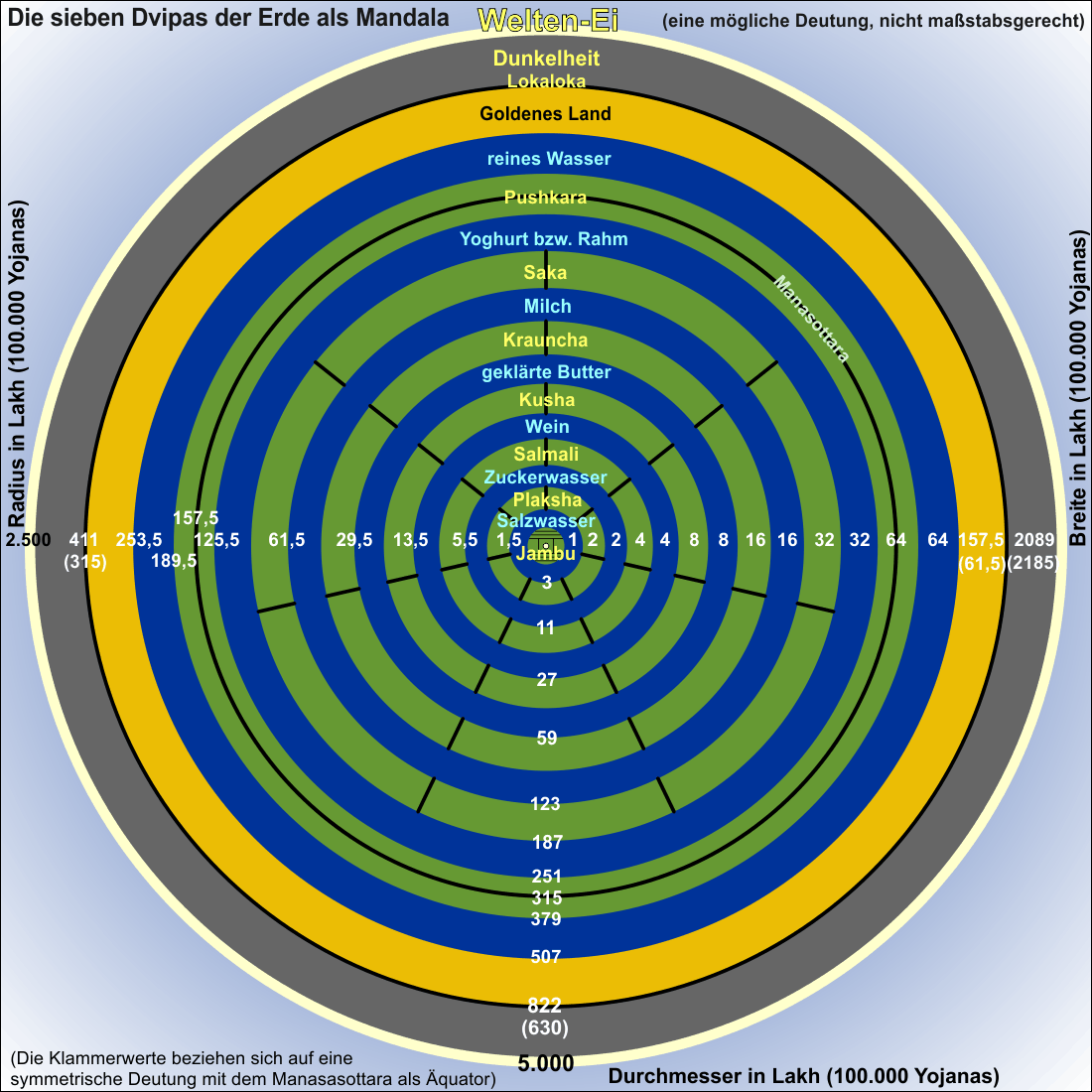 Jenseits davon befindet sich eine Region, die sich bis zum Berg Lokaloka erstreckt, der als Grenze der sichtbaren Welt gilt, und darüber hinaus herrscht völlige Dunkelheit. Diese Region ist so breit, wie der Abstand zwischen den Bergen Meru und Manasottara, und gleicht einem goldenen Land (das „Eigelb“ bzw. „Dotter“ im Welten-Ei), das so glatt wie ein Spiegel ist. (Eine andere Lesart wäre: „Diese Region erstreckt sich vom Manasottara Gebirge aus gesehen genau so weit, wie die Strecke bis zum Berg Meru.“ Damit würde eine Symmetrie mit dem Manasottara im Zentrum entstehen, die hier vermutlich auch gemeint ist. Die entsprechenden Zahlen aus dieser symmetrischen Sichtweise haben wir im unteren Kreisdiagramm in Klammern gesetzt.) Alles, was hierher kommt, kehrt nie wieder zurück, und deshalb wird diese Region von allen Lebewesen gemieden. Der Grenzberg Lokaloka befindet sich zwischen den Gebieten, die man als sinnlich sichtbar und unsichtbar bezeichnet (Aloka und Loka => Loka-Aloka = Lokaloka). Die Strahlen aller Leuchtkörper von der Sonne bis zum Bereich von Dhruva können unmöglich über diese äußere Grenze der drei Welten (von Himmel, Luftraum und Erde) hinausgelangen, die vom Höchsten Herrn geschaffen wurde. Die Gelehrten, die die Größen, Eigenschaften und Beziehungen der Welten untersuchten, haben das ganze Welten-Ei mit einer Größe von 500 Millionen Yojanas berechnet, von dem ein Viertel (diese Angabe ist unklar, nach den symmetrischen Werten wäre es ein Achtel, nämlich 63 Millionen Yojanas) innerhalb des sichtbaren Bereiches vom Berg Meru bis zum Lokaloka liegt.