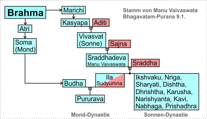 Oh Feindevernichter, so höre nun von mir die wichtigsten Aspekte der Nachkommen von Manu, denn nicht einmal hundert Jahre würden ausreichen, um alles ausführlich zu beschreiben. Als sich die Höchste Seele, die der Höchste Geist aller niederen und höheren Formen des Lebens ist, am Ende der Schöpfungstage (Kalpas) betrachtete, gab es nichts Existierendes im Universum mehr. Da wuchs aus seinem Nabel ein goldener Lotus, in dem der Selbstgeborene (Brahma) mit vier Gesichtern erschien. Aus den Gedanken von Brahma wurde Marichi geboren, und dessen Sohn war Kasyapa. Kasyapa zeugte mit Aditi, der Tochter von Daksha, den Sohn Vivasvat, der zum Sonnengott wurde. Vivasvat zeugte mit Sajna den Manu Sraddhadeva (bzw. Vaivaswata), der wiederum mit seiner Frau Sraddha mit gezügelten Sinnen zehn Söhne zeugte, nämlich Ikshvaku, Nriga, Sharyati, Dishtha, Dhrishtha, Karusha, Narishyanta, Prishadhra, Nabhaga und den mächtigen Kavi. Dabei hatte der Manu lange Zeit gar keine Söhne, aber der mächtige Heilige Vasishta brachte ein Opfer für die Götter Mitra und Varuna dar, um ihm Söhne zu gewähren. Doch während des Opfers trat Sraddha, Manus Frau, die nach den Geboten ein Gelübde beachtet hatte (ähnlich wie Aditi in Kapitel 8.16), ehrfurchtsvoll zu den Priestern und bat um eine Tochter. Der führende Priester war damit einverstanden und forderte den Opferpriester dazu auf, so daß der Brahmane geklärte Butter ins Feuer gab und das entsprechende Vashat Mantra (für die Geburt von Leben) rezitierte. Und damit wurde eine Tochter geboren. Als Manu sie sah, sprach er höchst unzufrieden zu seinem Lehrer (Vasishta):