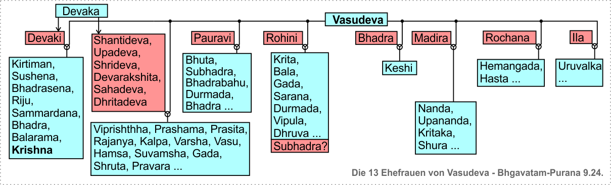 (Zu den 13 Ehefrauen von Vasudeva:) Die Ehefrauen von Vasudeva, der auch Anakadundubhi genannt wurde, waren neben den sieben Töchtern von Devaka Pauravi, Rohini, Bhadra, Madira, Rochana und Ila. Mit Rohini zeugte er die Söhne Krita, Bala, Gada, Sarana, Durmada, Vipula, Dhruva und andere. Zu den zwölf Söhnen von Pauravi gehörten Bhuta, Subhadra, Bhadrabahu, Durmada und Bhadra. Zu den Söhnen von Madira gehörten Nanda, Upananda, Kritaka und Shura. Kausalya (Bhadra) gebar ihm nur einen Sohn namens Keshi. Zu den Söhnen von Rochana gehörten Hasta und Hemangada. Der älteste Sohn von Ila hieß Uruvalka, der zu einem Führer der Yadus wurde. Mit den sieben Töchtern von Devaka zeugte Vasudeva folgende Kinder: Dhritadeva bekam einen Sohn namens Viprishthha. Zu den Söhnen von Shantideva gehörten Prashama und Prasita. Die Söhne von Upadeva wurden von Rajanya, Kalpa und Varsha angeführt. Die Ältesten der sechs Söhne von Shrideva waren Vasu, Hamsa und Suvamsha. Mit Devarakshita hatte er neun Söhne mit Gada als Ältestem. Mit Sahadeva hatte er acht Söhne, die von Shruta und Pravara (bzw. Pauvara) angeführt wurden und im Dharma den Vasus glichen (und ihre Verkörperungen waren). Mit Devaki zeugte Vasudeva acht vorzügliche Söhne, nämlich Kirtiman, Sushena, Bhadrasena, Riju, Sammardana, Bhadra und Sankarshana (Balarama), der Herr der Urschlange (Sesha). Und der achte von ihnen war der Höchste Herr selbst (Krishna). Und wie du weißt, ist seine Schwester Subhadra deine glückselige Großmutter, oh König.