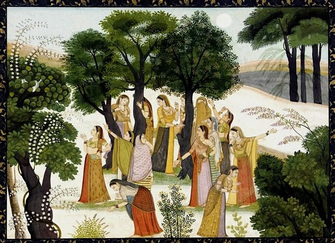 Oh Aswattha Baum, oh Plaksha und Nyagrodha, habt ihr den Sohn von Nanda gesehen, der so plötzlich verschwunden ist, nachdem er mit seinem liebevollen Lächeln unsere Herzen erobert hatte? Oh Kurabaka, Asoka, Naga, Punnaga and Champaka, habt ihr den jüngeren Bruder von Balarama vorbeigehen sehen, der mit seinem Lächeln den Stolz jeder unnahbaren Frau besiegt? Oh süßer Tulsi, hast du, der Govindas Füße so sehr liebt, unseren Liebsten gesehen, der dich als Girlande um seinen Hals trägt, die von Bienen umschwärmt wird? Oh Malati, Jati, Yuthika und Mallika Jasmin, habt ihr Madhava vorbeigehen sehen, der euch mit seiner Berührung so viel Freude bereitet? Oh Chuta, Priyala, Panasa, Asana, Kovidara, Jambu, Arka, Bilva, Vakula und Mango Baum, oh Kadamba, Nipa und alle, die so segensreich hier in der Nähe des Ufers des Yamuna leben, seid so freundlich und sagt uns bitte, deren Gedanken gestohlen wurden, welchen Weg hat Krishna genommen? Oh Mutter Erde, welche Askese hast du vollbracht, um von Krishnas Füßen mit so großer Freude berührt zu werden, daß deine Körperhärchen (die Gräser und anderen Pflanzen) zu Berge stehen? All deine Schönheit verdankst du der Berührung seiner Füße und seiner Umarmung. Und du, oh gute Hirschkuh, bist du unserem geliebten Krishna begegnet, der mit der Herrlichkeit seines Körpers ein Fest für die Augen ist? Überall liegt der Duft von der Girlande des Herrn in der Luft, die durch die Berührung von den Brüsten seiner Geliebten mit Kumkum eingefärbt wurde. Oh ihr Bäume, als der jüngere Bruder von Balarama hier mit dem Arm auf der Schulter seiner Geliebten vorbeiging, mit einem Lotus in der Hand und der Tulsi-Girlande um den Hals, die von berauschten Bienen umsummt wurde, hat er mit seinen liebevollen Blicken erkannt, wie ihr euch vor ihm verneigt? Oh ihr Schlingpflanzen, wir fragen auch euch! Obwohl ihr die Glieder eurer Ehemänner umarmt, so sieht man euch doch die Freude an, weil Krishna die Blüten für seine Geliebte von euch gepflückt hat.