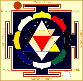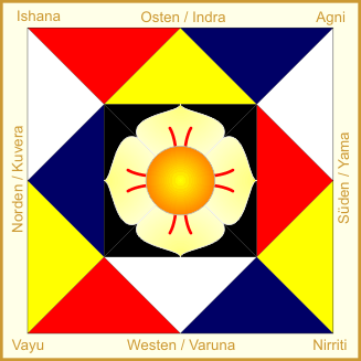 Nun höre, wie ich über das Mandala spreche, in dem der Vastu-Geist verehrt werden sollte. Auf einem Altar oder ebenem Boden, der mit sauberem Wasser gut gereinigt wurde, sollte eine gerade Linie in der Länge einer Elle (ca. 50cm) von der Vayu- zur Ishana-Ecke gezeichnet werden und in gleicher Weise von der Ishana- zur Agni-Ecke, von der Agni- zur Nirriti-Ecke und von der Nirriti- zur Vayu-Ecke, so daß ein Quadrat entsteht. Dann werden zwei Linien von Ecke zu Ecke (diagonal) gezogen, um das Mandala in vier Bereiche zu teilen, die Fischschwänzen gleichen. Danach sollte der gelehrte Verehrer die Fischschwänze teilen und jeweils zwei Linien von West nach Ost und von Nord nach Süd zeichnen. Und schließlich werden vier diagonale Linien durch die vier Ecken des inneren Quadrates von einer Seite zur anderen gezogen. Nach diesen Regeln sollte ein vorzügliches Yantra mit sechzehn Bereichen entstehen, die nun mit fünf verschiedenen Farbpulvern ausgefüllt werden. In den vier mittleren Bereichen sollte ein schöner Lotus mit vier weiß-gelben Blütenblättern, einer gelb-rötlichen Samenkapsel und roten Staubblättern gemalt werden. Der Raum dazwischen hat die All-Farbe (Schwarz). Beginnend mit der Ishana-Ecke (Nordost) werden die äußeren zwölf Bereiche mit den vier Farben Weiß, Dunkelblau, Gelb und Rot gefüllt (die Farben der Elemente Wasser, Wind, Erde und Feuer). Beim Ausfüllen der Bereiche geht man zu seiner Linken (gegen den Uhrzeigersinn) und beim Verehren der göttlichen Geister zu seiner Rechten (im Uhrzeigersinn). Der Vastu-Geist sollte im Lotus verehrt werden und seine zwölf Vastu-Geister mit Kapilasya an der Spitze in den zwölf äußeren Bereichen, beginnend in der Ishana-Ecke. Dann sollte man das Feuer nach den Kushandika Geboten weihen (siehe Kapitel 9.1.), nach besten Möglichkeiten Gaben opfern und das Vastu-Opfer beenden. Damit habe ich dir, oh Göttin, die Vastu-Verehrung beschrieben, die den Schutz vor allen Bedrängnissen durch Vastu und seine Geister gewähren kann.