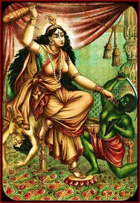 Die zehn Verkörperungen von Vishnu: Dieser Kampf gegen die Dämonen erinnert auch an die Rolle der zehn Verkörperungen von Vishnu als Fisch, Schildkröte, Eber, Menschlöwe, Zwerg usw.. Und so liegt es auch nahe, daß man im Kali-Zeitalter die zehn Mahavidyas als weibliche Entsprechungen oder Shaktis dieser Verkörperungen deutet.