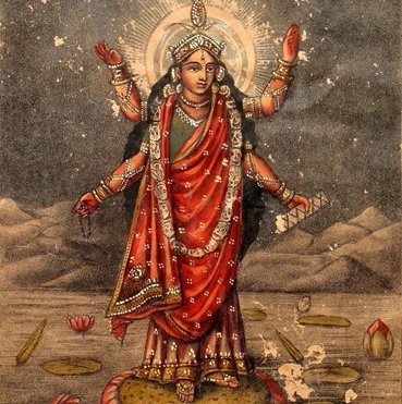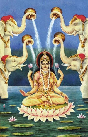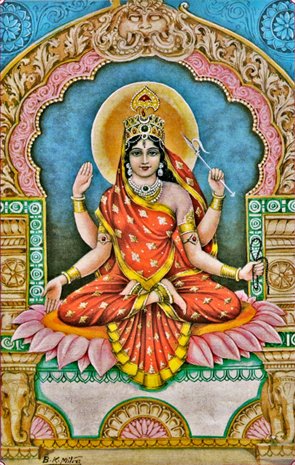 10. Kamala - die reine Liebe oder Lotusgöttin - die Befreiung: Sie ist wunderschön, lächelt und hat eine goldene Ausstrahlung. Mit ihren vier Händen hält sie zwei Lotusblüten und zeigt die Gesten des Schutzes und des Segnens. Haken und Schlinge sind verschwunden, der Elefant des Geistes ist beruhigt und durch reine Erkenntnis von Illusion befreit. So erlöst er nun auch die Natur und badet und reinigt die Göttin auf dem hellroten Lotus der Schöpfung mit dem Nektar der Unsterblichkeit:
