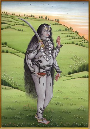Wie man sieht, haben die letzten drei Bilder große Ähnlichkeit. Doch die Schädelkette, die wir von Kali und Tara bereits kennen, und der Name Bhairavi deuten nun auch auf einen weiteren Aspekt hin, der sich unter dieser schönen Gestalt der Natur verbirgt. Bhairavi heißt auch „die Schreckliche“ und gilt als die weibliche Form von Bhairava, dem schrecklichen Aspekt von Shiva, der mit Zerstörung, Vernichtung und Tod verbunden ist. Sozusagen die nackte Natur, im Spiel der Gegensätze von Ananda-Bhairava oder auch Glück und Leid bzw. Zuckerbrot und Peitsche: