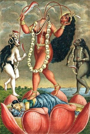 Entsprechend sieht man im Bild die Göttin nackt mit dem Schwert in der rechten Hand und ihrem Kopf in der linken. Sie wird vom roten Lotus der Schöpfung und von der Kraft der sinnlichen Liebe getragen, die das Paar von Kama und Rati, dem Liebesgott mit seiner Göttin, in sexueller Vereinigung symbolisiert. Ihre beiden Gefährtinnen werden als Jaya und Vijaya bezeichnet, was soviel wie Sieg und großer Sieg bedeutet. Sie stehen sich wie Gegensätze gegenüber. Die eine wird dunkel dargestellt und die andere weiß, was zusammen mit dem roten Körper der Göttin an die drei natürlichen Qualitäten von Güte, Leidenschaft und Trägheit erinnert, die drei Gunas von Sattwa, Rajas und Tamas mit den Farben Weiß, Rot und Schwarz. In diesem Sinne könnte man bezüglich Jaya und Vijaya auch von zwei Arten des Sieges sprechen, dem weltlichen und dem geistigen Sieg, die sich im allgemeinen Verlangen nach Gewinn oft gegenüberstehen und natürlicherweise mit der Leidenschaft verbunden sind. So sagt man auch: Weltlich gewonnen ist geistig verloren, und weltlich verloren ist geistig gewonnen. Denken wir zum Beispiel an die Erfindung des Taschenrechners und den Verlust des Kopfrechnens, oder an das Navi-System und den schwindenden Orientierungssinn, oder die zunehmende Bürokratie und die abnehmende Vernunft. Und wie sich das Internet auf Gedächtnis, Phantasie und Kreativität auswirken wird, das werden wir auch bald erfahren...