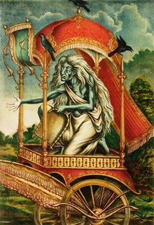 7. Dhumavati - das dunkle Alter - die Witwe: Über ihre Entstehung wird erzählt: Als Shiva mit seiner Frau Parvati im Himalaya auf dem Kailash wohnte, wurde sie hungrig und bat ihn um Nahrung. Aber Shiva hieß sie warten und versank in Meditation. Als der Hunger unerträglich wurde, fragte sie erneut: „Oh Vater des Universums, bitte gib mir Nahrung, ich kann nicht länger warten!“ Und als er nicht reagierte, sprach sie: „Nun gut, dann werde ich dich verzehren!“ Und daraufhin verzehrte sie Shiva, um ihren Hunger zu stillen. Doch sogleich stieg dunkler Rauch aus ihrem Körper, Shiva öffnete in ihrem Inneren das dritte Auge und sprach: „Ohne mich wird es keinen Geist (Purusha) mehr im Universum geben, sondern nur noch Natur (Prakriti)!“ - So wurde die Natur im Rauch der Illusion zur alten Witwe, dunkel, umwölkt, häßlich, schmucklos, mager und gebrechlich, mit ausgetrockneten Brüsten, hängendem Bauch, ausgefallenen Zähnen, wirrem Haar, verschrumpelter Haut und verbrauchter Kleidung. Sie verliert das dritte Auge und sitzt auf einem gebrechlichen Wagen, den niemand mehr zieht. Der Wagen steht unter dem Banner von Krähen, die als Aasfresser die Vergänglichkeit symbolisieren. In der einen Hand hält sie einen Worfelkorb und mit der anderen zeigt sie die Geste des Verlangens. Ihr Wesen ist derb, und sie ist fortwährend hungrig, durstig und unzufrieden:
