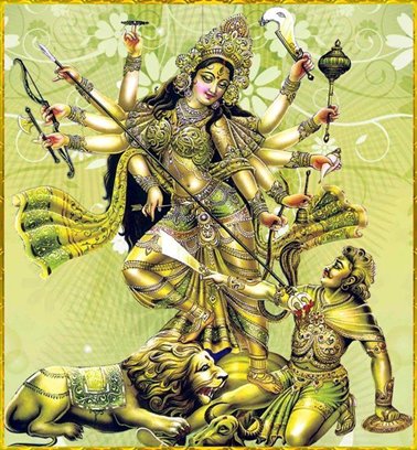 Die Mahavidyas als Formen von Durga: Darüber hinaus gibt es viele Geschichten, in denen die Götter die große Göttin in Gestalt von Durga mit ihren Waffen ausrüsten und zum Kampf gegen die Dämonen bitten. Durga erscheint mit vielen bewaffneten Armen, mit drei Augen und auf einem Löwen reitend. Als Dämonen werden hier gewöhnlich Wesen beschrieben, die von den Göttern mit großer Macht gesegnet wurden, doch ihre Macht nur auf die äußere Welt richten, in Illusion versinken, übermäßigen Stolz und Egoismus entwickeln und nach körperlicher Unsterblichkeit greifen. Aus dieser großen Illusion (Mahamaya), verkörpert sich die große Göttin in Gestalt von Durga und vielen anderen weiblichen Wesen, die man auch Shaktis (Naturkräfte) nennt, um die Dämonen aus ihrem Traum zu rütteln. Diese Shaktis haben zumindest Ähnlichkeit mit den Mahavidyas und werden auch in jüngeren Text in diesem Zusammenhang genannt. Eine typische Geschichte über den Kampf von Durga gegen die übermächtigen Dämonen ist das Devi-Mahatmya im Markandeya-Purana.