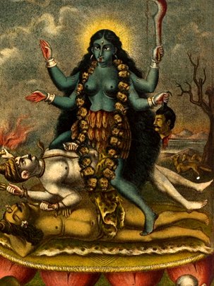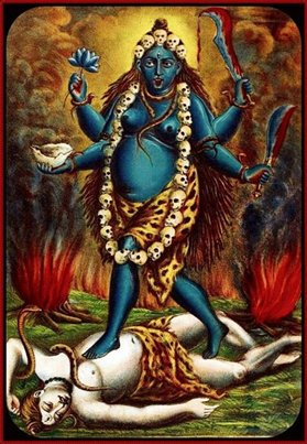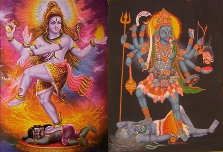 Wenn zuvor Shiva als Schöpfer, Erhalter und Vernichter auf dem Weltenzwerg tanzte, so sieht man nun die Natur in Gestalt von Kali auf Shiva stehen, der wie tot am Boden liegt. Bei der Betrachtung solcher Bilder, sollte man natürlich nie vergessen, daß es sich immer noch um ein und dasselbe Wesen handelt, die Gottheit, die praktisch jede erdenkliche Form annehmen kann: