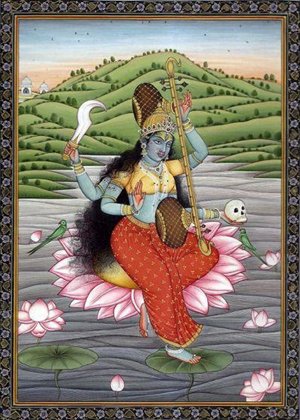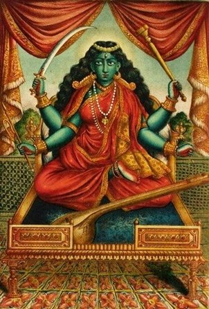9. Matangi - die den Elefanten zügelt - die Erkenntnis: Wir sehen die juwelengeschmückte Göttin in ihrer vollkommenen Gestalt, sechzehn Jahre alt, mit dem dritten Auge des Geistes, mit blankem Schwert, Keule, Schlinge und Elefantenhaken. Ihr Körper ist grün oder blau, sie sitzt auf einem Thron, und vor ihr liegt eine Laute: