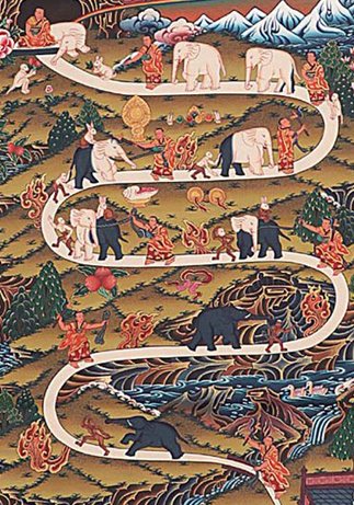 Und wer ist mit dem Elefanten gemeint? Der Elefant steht für Stärke und Macht. Er hat ein sagenhaftes Gedächtnis und ein menschenähnliches Gefühlsleben, ist gelehrig, klug und sehr sensibel. So ist der Elefant vermutlich ein altes, aber eigenartigerweise nur noch wenig verwendetes Symbol, für das mächtige Geistwesen mit all dem angesammelten Karma und den Neigungen, Erinnerungen, Gefühlen, Wünschen und Gedanken. Wobei die Gedanken schon mehr an Affen erinnern, die sich gierig auf alles stürzen, was nach Nahrung aussieht. Denken wir an die Affenarmee im Ramayana, die hier jedoch wohlgeführt eine große Hilfe im Kampf wurde. Das Elefanten-Symbol begegnet uns zum Beispiel in den Diggajas, welche die Erde tragen, in Ganesha, der für seine große Intelligenz bekannt ist, oder auch in der buddhistischen Überlieferung zu den Stufen der Geisteszügelung (Shamatha):