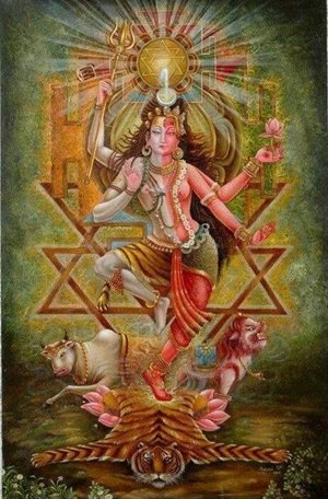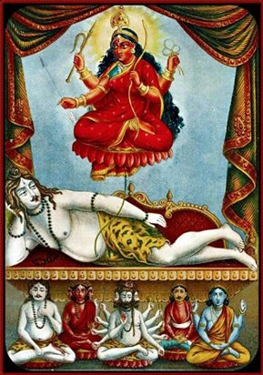 3. Tripura Sundari - die Geliebte der drei Welten - Geburt und Kindheit: Damit verkörpert sie das Schöne und Liebenswerte, was wir bei Kali und Tara bisher vermißt haben. Sie strahlt wie die aufgehende Sonne, hält Schlinge, Haken, Pfeil und Bogen in ihren vier Händen und sitzt auf einem Lotusthron, der aus dem Nabel von Shivas Bauch wächst. Shiva liegt wiederum auf einem Thron, der von den Göttern Sadashiva, Brahma, Rudra, Ishana und Vishnu getragen wird: