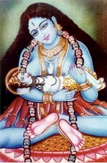 2. Tara - die Mitfühlende - die Schwangerschaft: Auf dem ersten Blick erkennt man kaum einen Unterschied zwischen Tara und Kali. Im folgenden Bild trägt sie Schwert, Messer, Schädelschale und blauen Lotus. Sie ist mit Schlangen, Kette und Krone aus Totenschädeln und einem Tigerfell geschmückt. Ihre Zunge leckt nach Blut, um sie herum brennen Leichenfeuer, und auch sie wird von Shiva getragen, der noch wie leblos am Boden liegt. Ihre Brüste sind prall und ihr Bauch dick. Letzteres ist ein besonderes Zeichen von ihr und deutet auf die Geburt von neuem Leben hin, wie auch der Lotus als Symbol der Schöpfung. So könnte man auch sagen, Tara steht am Anfang des Lebens und Kali am Ende. Damit wären sie zwei Aspekte von dem dunklen, ungreifbaren Punkt, wo sich Tod und Geburt treffen und sich der Lebenskreis schließt.