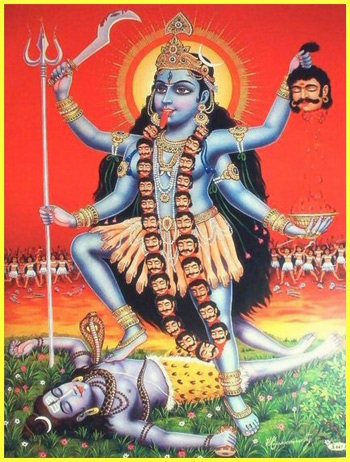 Nachdem Sumbha den Giganten seine Befehle gegeben hatte, marschierten Chanda und Munda an der Spitze der vier Arten von bewaffneten Armeen in den Kampf. Die Göttin, welche auf ihrem Löwen über dem Gipfel dieses wunderbar goldenen Berges thronte, sah sie mit einem Lächeln kommen. Die Dämonen erblickten sie und waren höchst bestrebt, ihre Befehle auszuführen (und sie gefangen zu nehmen). Und die Schwertträger und Bogenkämpfer versammelten sich in ihrer Nähe. Doch Ambika wurde schrecklich zornig auf ihre Feinde. Die Wut gab ihrem Antlitz eine fürchterliche Dunkelheit. Ihre zusammengezogenen Augenbrauen überschatteten ihre Stirn, und die schrecklich gestaltete Kali schwang ihr alldurchdringendes Schwert. Sie trug den alles zerstörenden Stab der Zeit, der an seinem oberen Ende mit einem Totenschädel gekrönt ist. Sie war mit einer Girlande aus Menschenköpfen geschmückt und in ein Tigerfell gehüllt. Ihr Körper war schrecklich ausgehungert, mit gähnendem Rachen, feurig züngelnder Zunge und zornig rotgefärbten Augen. Ihr Antlitz erfüllte alle Bereiche mit Schrecken. Sie fiel wütend über die Dämonen her, zerstörte die Feinde der Götter und verschlang ihre Kräfte. Mir der einen Hand ergriff sie die Elefanten mit aller Bewaffnung und mit der anderen ihre Reiter und stopfte sie in ihren alles verzehrenden Schlund. So verschlang sie auch die vielen Kampfwagen mit ihren Pferden und Kämpfern.
