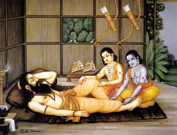 Die heiligen Männer bemerkten mit von Buße weitreichendem Blick ihr Kommen und mit großer Freude füllte sich jede heilige Brust. Sie boten dem Sohn des Kusik die Willkommensgabe, die geehrte Gäste grüßen sollte, nebst Wasser zum Waschen der Füße und große Ehren an. Auch Rama und Lakshmana bekamen ihren angemessenen Anteil. Die Gäste blieben in liebliches Gespräch vertieft und entzückten jeden Zuhörer. Und als die abendlichen Gebete mit stillen und tiefen Stimmen gesprochen waren, da bettete ein jeder sein Haupt auf den Boden und schlief bis zur Morgendämmerung.