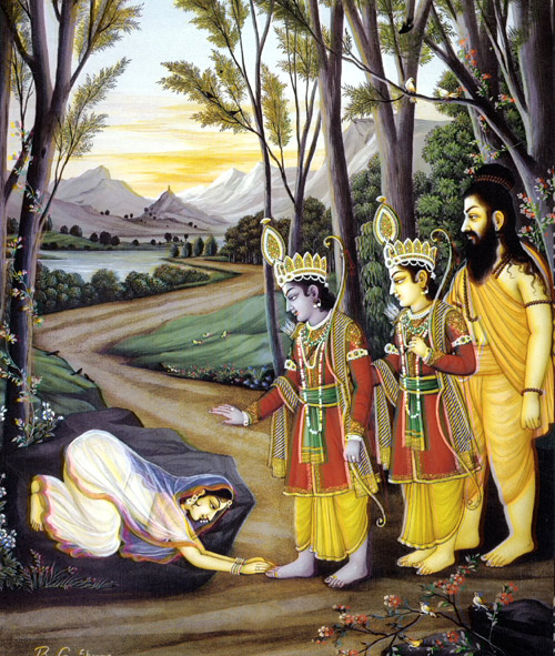 Mit großer Freude, der Dame zu begegnen, berührten die Söhne des Raghu ehrend ihre Füße. Und sie, sich an Gautamas Schwur erinnernd, empfing die beiden mit sanfter Grazie. Sie offerierte Wasser für die Füße und all die Gaben für Gäste, die jeder Fremde ersehnt. Rama ward sich der Höflichkeitsregeln bewußt und akzeptierte ganz angemessen die Fürsorge der Dame. Da regnete es ausgiebig Blumen vom Himmel, und die Musik der Himmlischen erklang. Die Nymphen und Musiker tanzten und sangen dazu, und alle Götter priesen im glücklichen Chor die große Dame und riefen: 'Jubel! Durch leidenschaftliche Askese nicht mehr beschmutzt, und wieder mit dem Gatten versöhnt!' Gautama, der heilige Einsiedler, wußte sofort Bescheid, daß Rama im Schatten des Wäldchens weilte, denn nichts entging seinem göttergleichen Blick. So eilte er zugegen, um seine Reverenz zu erweisen. Er nahm Ahalya, die von Sünde und Torheit Gereinigte, wieder an seine Seite und ließ seine neu-gefundene Gemahlin an den Verdiensten seiner Enthaltsamkeit teilhaben.