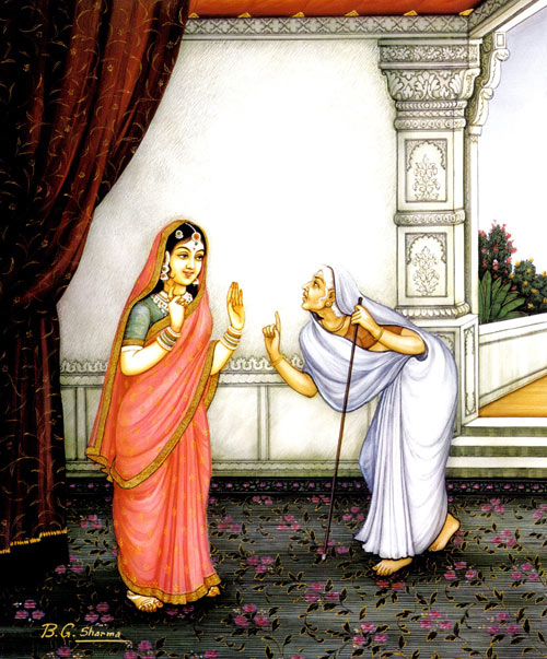 Und die Amme erzählte mit übersprudelndem Jubel der buckligen Manthara die frohe Geschichte: "Unser Herr und König wird morgen seinen ältesten Sohn salben und den Prinzen Rama zu Pushyas glücksverheißender Stunde in den Rang eines Königs erheben." Als solcherart die Amme sprach, erhob sich Wut in der Buckligen Brust. Schnell verließ sie die Terrasse, die dem Gipfel des hohen Kailash glich, und rannte mit Sünde in ihren Gedanken und entflammter Seele dorthin, wo Königin Kaikeyi schlief. "Warum schläfst du?", rief sie. "Erhebe dich, denn Gefahr droht dir. So öffne doch deine Augen. Oh, unachtsame Königin, du bist zu blind, um zu bemerken, welche Flut von Sünde sich über dich ergießt! Der Liebe und der Gunst deines Königs kannst du dich nicht mehr rühmen: Dir bleibt nur der Schein und nichts anderes. Seine Gunst ist nur ein leerer Schwindel, ein ausgetrockneter Strom in der Sommerhitze."
