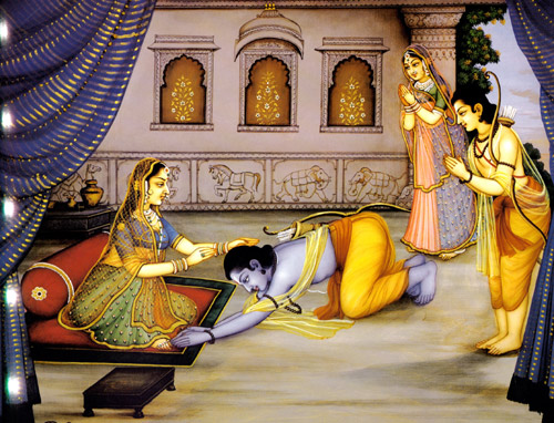 Die großäugige Dame verstummte und schüttete reinen Duft und geheiligtes Korn über sein Haupt. Und dieses gepriesene Gewürz, dessen überragende Kraft vor der dunklen Unglücksstunde bewahrt, wand sie um den Arm des Helden wie ein treues Amulett. Und während sie heilige Sprüche murmelte und frohe Worte sprach, verbarg die von Kummer Zerstörte mit gehorsamer Zunge die Schmerzen, die ihr Herz peinigten. Sie beugte sich, küßte seine Stirn und drückte ihren Liebling an die verstörte Brust: "Geh und sei standhaft" rief sie, "geh Rama und Glück sei mit dir! Komme heil wieder und lebe im Triumph in Ayodhya. Dann sollen meine frohen Augen das Königreich erblicken, wie es von deinem Willen kontrolliert wird. Dann sollen Kummer und Sorge keine Spur mehr hinterlassen und Freude soll deiner Mutter Gesicht überstrahlen. Ich werde meinen Liebling anschauen, wie er regiert in mondgleicher Herrlichkeit. Diese Augen sollen zärtlich auf dir ruhen, der so treu seines Vaters Befehl folgt, wenn du die Wildnis des Waldes verlassen hast und auf deinem angestammten Thron sitzt. Ja, du sollst aus dem Exil heimkehren, ohne Mangel an den auserlesensten Segnungen, und meine Brust und die deiner Gemahlin mit neuem Entzücken füllen.