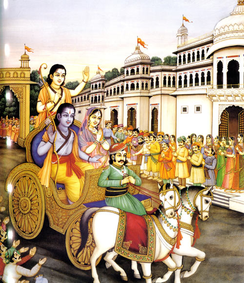 Wie Matali als Wagenlenker sprach, auf daß der Gott der Götter ihn hören möge, so rief Sumantra, Hand an Hand gelegt und in Demut geübt, zu Rama: "Oh berühmter Prinz, besteige meinen Wagen. Möge Segen deinen Weg begleiten. Schnell sollen dich meine Pferde davontragen, zu jedem Ort, um den du mich bittest. Deine vierzehn Jahre, die du im Walde bleiben sollst, beginne sie heute. Denn Königin Kaikeyi ruft: Hinfort!"