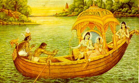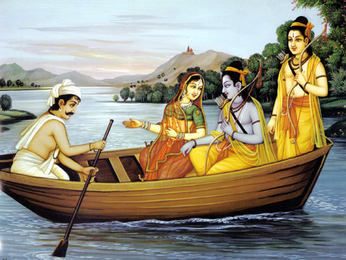 Im Anblick des vorbereiteten Bootes am Ufer der heftig wogenden Fluten der Ganga sprach er zu Lakshmana: "Bruder, steig ein, strecke deine Hand aus und biete deine zarte Hilfe Sita an. Achte sorgsam auf ihre zitternden Schritte, und laß die Dame neben dir sitzen." Hilfsbereit folgte Lakshmana den Worten seines Bruders. Er half der Dame, im Boot Platz zu nehmen, und dann setzte sich der Held neben sie. Als nächstes bestieg Rama das Boot, der Gott des strahlendsten Ruhmes, und, nachdem er an Bord war, murmelte er ein Gebet um Segen, welches für Priester und Krieger gleichermaßen der Wiederholung würdig ist. Dann beugten er, der wagengeborene Lakshmana und Sita zufrieden und demütig die Häupter und schöpften mit ihren Händen und nippten etwas Wasser, wie es die Schriften erbitten. Noch ein Lebewohl ging an Sumantra, Guha und sein Gefolge. Dann befahl Rama, der an Bord seinen Platz eingenommen hatte, das Ablegen des Bootes. Durch kräftige Arme auf den Weg gebracht und vom Steuermann auf Kurs gehalten, eilte das Boot durch die forschen Wellen der Ganga. Auf halbem Wege durch den Strom, legte die von Befleckung und Schande freie Sita die Hände aneinander und sprach zur Göttin des Stromes: "Möge der große, von Dasaratha abstammende Führer, der Beste der Könige, von dir beschützt den königlichen Willen seines Vaters erfüllen. Wenn er die vierzehn Jahre seiner Verbannung im Walde hinter sich gebracht hat, soll mein Herr mit seinem Bruder und mir seine Heimat wiedersehen und an einem glückseligen Tage heimkehren. Ich werde dir meine Opfer widmen, liebe Königin, deren Wasser sanft fließen, denn du kannst alle gesegneten Gaben vollbringen. Obwohl du, dreiarmige Königin, hier wanderst und dein herrlicher Strom sich hier entrollt, entstammen deine Wellen der Sphäre Brahmas, du Höchste der Fluten. Vor dir, schöne Königin, beuge ich das Haupt, und dir widme ich die Lobeshymnen, wenn mein tapferer Herr wieder heimkehren und freudig über sein Königreich herrschen wird. Um deine Gunst zu gewinnen, oh göttliche Königin, werde ich hunderttausend der schönsten Kühe, kostbare Kleidung und feinste Speisen unter den Brahmanen verteilen. Hundert Kannen Wein sollen fließen, wenn ich, oh Königin, wieder heimkehre, auch Fleisch und Mais und Reis werde ich erfreut opfern. Jeder geheiligte Ort, jeder heilige Schrein an deinen schönen Ufern, jeder Tempel und Altar an deinen Böschungen soll mein Opfer und meinen Dank teilen. Möge er, der ohne Schuld und starken Armes ist, mit mir und Lakshmana unverletzt den Wald verlassen und Ayodhya aufsuchen, oh reine und unschuldige Dame."