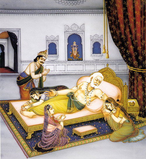 Kausalya und Sumitra wachten an seiner Seite, während er weinte. Und so starb Dasaratha, um seinen Liebling stöhnend und seufzend.