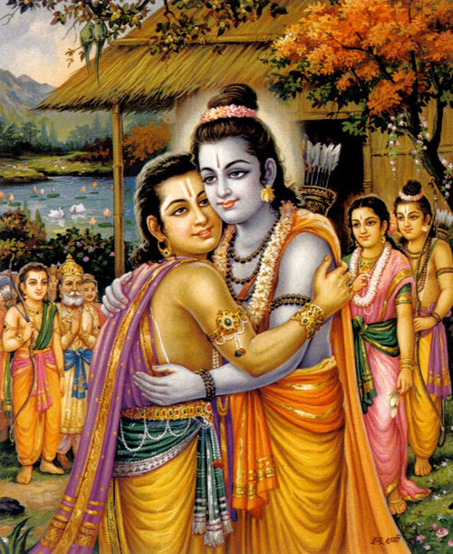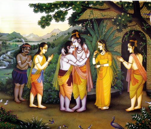 Dort saß Rama, sein Herr, mit verfilzten Haaren und in Hirschfelle gekleidet. Mit seinen Löwenschultern breit und stark, und mit Lotusaugen sollte er der allerhöchste Herr zwischen den Ozeanen sein. Hochbeseelt und für ein hohes Schicksal geboren, saß er mit Lakshmana und Sita an seiner Seite wie Lord Brahma selbst, der Höchste der Großen. Und Bharata starrte für eine Weile und war vor Schmerz ganz dumpf. Dann, seine Gelähmtheit abstreifend, rannte er zu Rama und begann unter Schluchzen zu sprechen: "Er, der einen königlichen Thron zu füllen hätte, mit Dienern um ihn, die seinen Willen tun, mein älterer Bruder - seht ihn hier von Waldbewohnern umgeben. Der hochbeseelte Held, der gewohnt war, die kostbarste und schönste Kleidung zu tragen, hüllt sich als Verbannter in ein Hirschfell und bleibt auf dem Pfad der Tugend. Wie erträgt der Sohn des Raghu die schweren Locken, die seine Stirn bedecken, wenn sonst um das prinzliche Haupt süße Blumen der seltensten Sorten gewunden waren? Der Prinz, dessen Verdienste durch Zeremonien schon angewachsen waren, muß nun einen noch reicheren Vorrat an Verdienst gewinnen, und zwar durch die Plagen und Mühen an seinem Körper. Diesen Gliedern verlieh reiner Sandel einen frischen Duft, nun sind sie der Sonne, auch Staub und Regen ausgesetzt und von vielen Flecken bedeckt. Und ich bin der armselige Grund, warum all dies auf diesen Prinzen kam, der ein Recht auf Glück hat! Weh mir, daß ich einst geboren wurde, um von den Menschen verachtet und gehaßt zu werden."