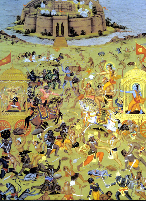 Mit wunderbarer Kraft, Macht und Geschick focht der Gigant mit Rama immer weiter. Jeder trieb seinen Wagen gegen den Feind und suchte Sieg oder Tod. Die Pferde der Krieger prallten zusammen, und Deichsel brach widerhallend an Deichsel. Dann schoß Rama Pfeil auf Pfeil und ließ Ravanas Pferde schwenken und zusammenzucken. Doch auch Lankas Herr war nicht langsam und ließ seine Pfeile auf den Feind regnen, welcher, von den scharfen Spitzen angegriffen, keine Spur von Schmerz zeigte und weder verzagte noch wankte. Rama schoß dichte Wolken von Pfeilen mit seinem starken Arm, der niemals ruhte. Und von Ravanas Hand fielen in gräßlichem Hagel Speer, Keule und Feuer. Der ungestüm geschleuderte Sturm von Geschossen wirbelte mit seinen Winden die Ozeane auf, und Schlangengötter und Unholde, welche tief unter der Oberfläche lebten, wurden aufgestört. Die Erde mit ihren Bergen, Ebenen, Bächen, Hainen und Gärten schwankte und bebte. Die Sonne selbst wurde bleich und kühl, und die sich erhebenden Winde trugen die Angst mit sich. Gott, Gandharva, Weiser und Heiliger schrien auf, geschwächt von Kummer und Elend: "Oh, möge der Prinz aus Raghus Linie Brahmanen und Kühen Frieden geben und, die Welt rettend, den Giganten, unseren schrecklichen Feind, besiegen." Dann legte der Stolz der Raghus einen Pfeil auf seine tödliche Sehne, so scharf wie der Giftzahn einer Schlange. Der Pfeil sprang direkt zum Ziel und trennte mit schneidendem Stahl den monströsen Kopf vom Körper des Giganten. Die dreifache Welt konnte den mit Gold verzierten abgetrennten Kopf sehen. Doch als alle Augen darauf gerichtet waren, wuchs an seiner Stelle flugs ein anderer nach. Erneut wurde ein Pfeil wohl gezielt, und erneut fiel das Haupt abgetrennt zu Boden. Doch als es am Boden auftraf, wuchs wieder ein neues nach. Hunderte helle Flammenhäupter fielen so dem Ziel des Siegers zum Opfer, doch Ravana zeigte kein Zeichen von Tod oder nachlassender Stärke. Er hielt den zweifelhaften Kampf aufrecht und ließ seine Pfeile weiter auf den Feind regnen. In der Luft, am Boden, auf Ebene und Berg kämpfte er mit schrecklicher Macht weiter, und durch die Stunden der Nacht und des Tages kannte der Kampf weder Pause noch Ende.