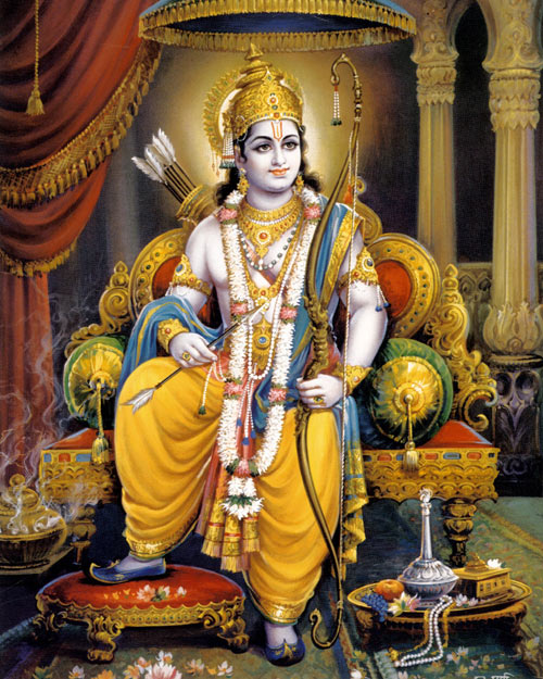 Kakuthsta, sich selbst erkennend, ward nun rechtens auf dem Thron installiert. Dies vermehrte die Freude der Bürger, und die erste Nacht ging vorüber. Am Morgen kamen die Diener in den Palast, um den König aufzuwecken. Wohl geübt und mit musikalischen Stimmen wie Kinnaras begannen die Sänger, den heroischen König zu lobpreisen, um sein Vergnügen zu vergrößern: "Erwache, oh freundlicher Held, der du Kausalyas Freude mehrst, du Bester der Männer. Wenn du schläfst, wird das ganze Universum mit Schlaf zugedeckt. Du gleichst dem Vishnu in Heldenmut, in Schönheit den beiden Aswins, in Verstand dem Vrihaspati, und in der Fähigkeit des Regierens bist du dem Patriarchen Brahma gleich. Deine Geduld gleicht der Geduld der Erde, dein Glanz ist wie die Sonne, deine Schnelligkeit gleicht dem Wind und dein Ernst der Tiefe. Du bist standfest wie ein Pfosten und sanft wie der Mond. Kein König wie du gedieh zuvor und kein ebenbürtiger wird folgen. Oh du Bester der Männer, du bist unbezähmbar, allseits fromm und immer damit beschäftigt, das Wohl deiner Untertanen zu bewirken. Ruhm und Reichtum werden dich niemals verlassen. Oh Kakuthsta, in dir leben beständig Barmherzigkeit und Fülle." So priesen ihn die Minnesänger mit vielen lieblichen Stimmen, und Raghava stand auf. Wie Hari sich von seinem Schlangenbett erhebt, so erhob er sich inmitten der Loblieder von seinem mit einer weißen Decke geschmückten Bett. Mit weißen Gefäßen voller Wasser standen tausende wohlgeübte Diener vor dem hochbeseelten Rama. Er spülte seinen Mund, und so gereinigt bot er sein Opfer dem Feuer dar. Dann betrat er den heiligen Raum der Schutzgottheit, welche die Ikshvakus sehr verehren. Dort betete er zu allen Himmlischen, Ahnen und Brahmanen und ging dann, von vielen Menschen umgeben, zu den äußeren Räumen des Palastes. Es erschienen die führenden Priester von Vasishta angeführt und alle Minister so strahlend wie Feuer. Um Rama saßen die Kshatriya Könige, die von verschiedenen Provinzen herbeigerufen worden waren, wie die Götter ihren Herrn Indra umgeben. Die berühmten Brüder, Bharata, Lakshmana und Shatrughna, verehrten ihn, und er erschien wie ein Opfer, welches von den vedischen Hymnen begleitet wird. Die Diener saßen mit geschlossenen Augen um ihn. Auch die zwanzig heldenhaften Vanars, vom höchst mächtigen Sugriva angeführt, bezeugten ihm ihre Verehrung. Wie die Guhakas den Kuvera ehren, so wartete ihm Vibhishana in Begleitung seiner vier Rakshasas auf. All jene, die im Studium der Veden vorzüglich waren, gelehrt und in ehrbaren Familien geboren wurden, beugten vor dem König ihre geneigten Häupter. Wie der Götterkönig Indra von den Heiligen geehrt wird, so empfing König Rama die fortwährende Verehrung der strahlenden Heiligen, Könige, Vanars und Rakshasas. Zu dieser Zeit erschien er sogar noch schöner als Indra. Dann wurden religiöse Themen rezitiert in dieser Versammlung von Personen, welche vertraut mit dem Wissen der Puranas waren.