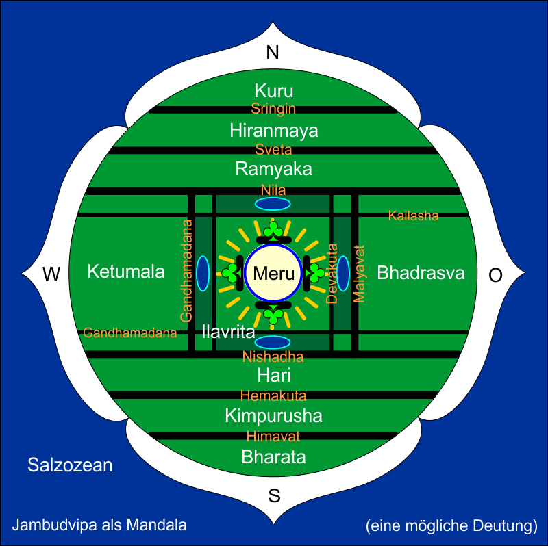 Südlich vom Meru stehen die Gebirgsketten Himavat, Hemakuta und Nishadha, und nördlich die Gebirgsketten Nila, Sveta und Sringin. Sie erstrecken sich über 10.000 (bzw. bis zu 100.000) Yojanas und funkeln im Glanz von rötlichen Juwelen. Sie sind 1.000 Yojanas hoch und auch breit. Dazwischen liegen im Süden von Meru die Länder (Varshas) Bharata, Kimpurusha und Hari, und im Norden von Meru Ramyaka, Hiranmaya und Kuru. Jedes Land ist 9.000 Yojanas breit. In der Mitte liegt das Land Ilavrita, auf dem der Meru steht. In alle vier Himmelsrichtungen erheben sich hier 9.000 Yojanas hohe Gipfel, die wie Strahlen den Meru umgeben und zu ihm gehören. Das ist im Osten der Mandara, Gandhamadana im Süden, Vipula im Westen und Suparsva im Norden. Die großen Bäume, die wie Flaggen auf dem Berg fungieren, sind Kadamba, Jambu, Pippala und Vata. Sie sind 1.100 Yojanas hoch.