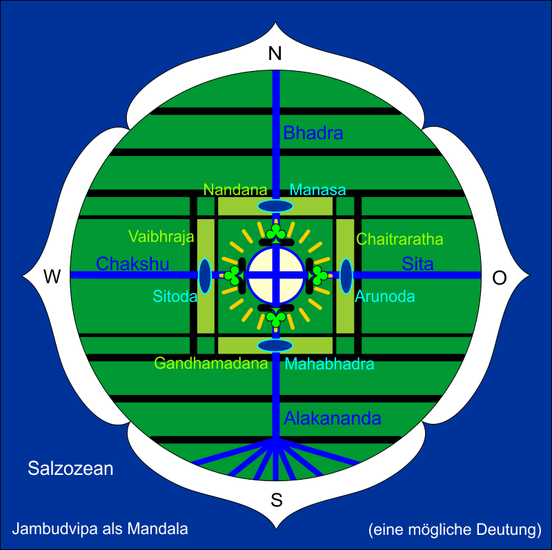 Im Osten des Meru liegt das Land Bhadrasva, im Westen Ketumala, und dazwischen ist Ilavrita. Der Wald im Osten heißt Chaitraratha, der im Süden Gandhamadana, der im Westen Vibhraja und der im Norden Nandana. Es gibt vier Seen um den Meru herum, an denen sich die Götter erfreuen: Arunoda, Mahabhadra, Sitoda und Manasa. Es gibt noch mehrere bedeutende Berge, die den Meru wie Staubblätter umgeben. Im Osten sind das Satanjana, Kurunga, Kurara und Malyavat. Im Süden stehen Trikuta, Sisira, Patanga, Rucaka, Nishadha, Kapila und andere. Im Westen sind es Sinivasa, Kusumbha, Kapila, Narada, Naga und andere. Und im Norden stehen Sankhacuda, Rishabha, Hamsa, Kalanjara und noch andere. Auf dem Gipfel des Meru befindet sich Brahmas goldene Stadt Satakaumbha, die sich über 14.000 Yojanas erstreckt. Rund herum gibt es noch acht weitere Städte für die Wächter der Himmelsrichtungen. Von Vishnus Füßen strömt die heilige Ganga und fließt durch Brahmas Stadt und das Reich des Mondes. Dann teilt sie sich in vier Richtungen und fließt in folgenden Strömen weiter: Sita, Alakananda, Cakshus und Bhadra. Sita fließt gen Osten, Alakananda gen Süden, Chakshus gen Westen und Bhadra gen Norden. So fließt die große Ganga auf drei weiteren Pfaden an den Bergen vorbei in alle vier Himmelsrichtungen und ergießt sich schließlich ins Meer.
