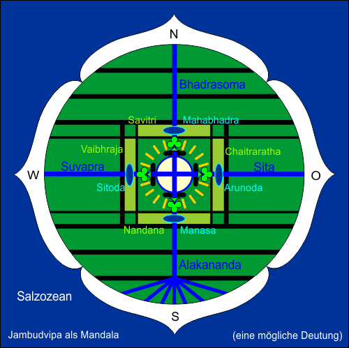 Von den vier Seiten fällt der strahlende heilige Strom zuerst auf den Stützberg Mandara im Osten, ein Berg voller Bäche, Höhlen, goldener Täler und schimmernder Kämme, wo die Götter und Siddhas wohnen. Dieser östliche Zweig des Flusses fließt mit kristallklarem Wasser, das den Stolz und die Begierde auflöst, über den Mandara rund um den schönen Garten Chaitraratha und durch den vorzüglichen See Arunoda. Nachdem er diesen See verlassen hat, fällt dieser liebenswerte Strom mit vielen Fontänen auf den Berg Shitanta, wo viele Siddhas leben. Dieser heilige und ausgezeichnete Fluß wird Sita genannt, schlängelt sich durch zauberhafte Haine und Wälder und spaltet sich dort in viele Zweige. Vom Gipfel des Shitanta fällt der Hauptstrom auf den Berg Sukunja und von dort auf den Berg Sumanjasa. Weiter geht die heilige Reise über die Bergkette Malyavan zu den Bergen Vaikanka, Maniparvata und Risabha, der an Höhlen reich ist. Nachdem er hunderte Berge durchbrochen hat, erreicht er den Berg Jathara, der von Heiligen bewohnt ist. Von hier aus fließt er bis zum Berg Devakuta, dessen niederer Teil sich bis zum Ozean erstreckt. Auf diese Weise erreicht der Fluß nach und nach die tieferen Ebenen. So fließt dieser heilige Strom über hunderte Berge, durch tausende Täler, mächtige Wälder und verschiedenste Seen in endlosen Schlingen mit tausenden Nebenflüssen über den großen östlichen Kontinent Bhadrashva und endet schließlich im östlichen Ozean.