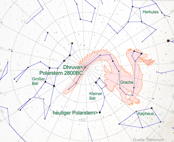 (Man nimmt an, daß es sich bei dieser Sternkonstellation um unseren heutigen Drachen handelt, wobei Drache-Alpha (Thuban) wegen der Präzession vor ca. 4800 Jahren, also um 2800BC, der Polarstern gewesen sein könnte:)