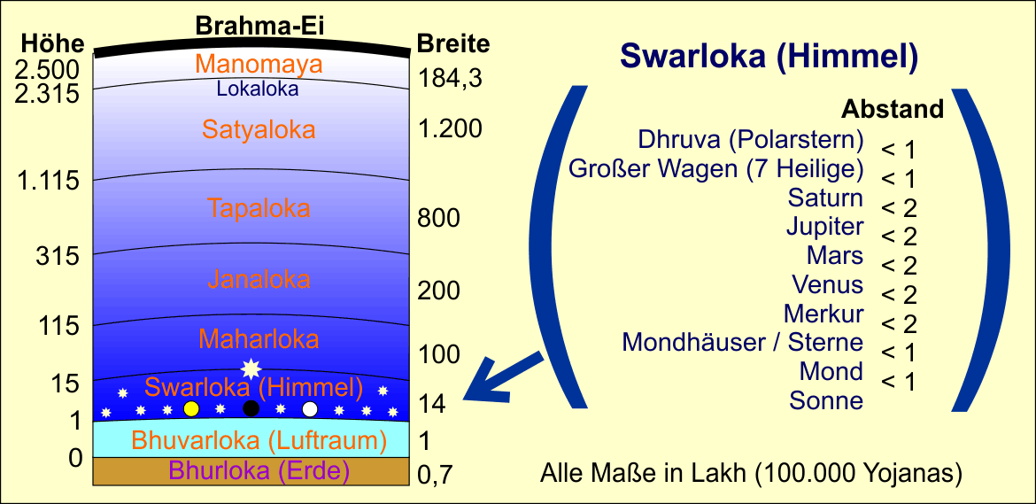 In seiner runden Ausdehnung befindet sich die Erde als Bhurloka in der Mitte. Der Luftraum befindet sich als Bhuvarloka zwischen Erde und Sonne. Der Bereich zwischen der Sonne und dem Polarstern Dhruva ist der Himmel mit dem Firmament und wird Swarloka genannt. Und der Bereich zwischen Dhruva und Janaloka heißt Maharloka.