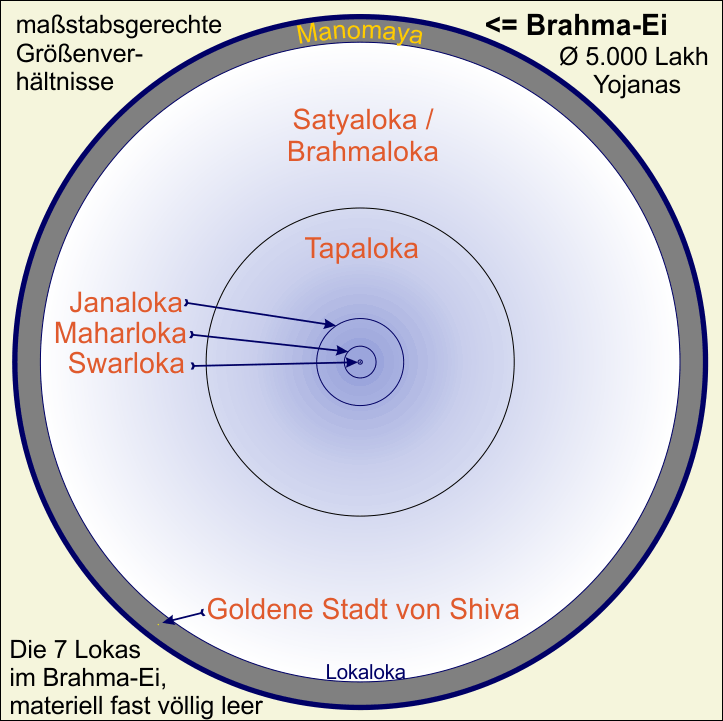Nun hört und versteht wie ich die Details ordnungsgemäß erkläre. Die Distanz von der Erde bis zum Ende des Brahmaloka beträgt 131.500.000 (131500000) Yojanas (vermutlich 231.500.000 (231500000)), und der Raum zwischen Brahmanda (dem Brahma-Ei) über dem Brahmaloka beträgt 15 Millionen Yojanas (laut Rechnung 18,43 Millionen, siehe obiges Bild). Das ist der höchste Ort, den man (im Brahma-Ei) erreichen kann. Jenseits davon kann niemand gehen.