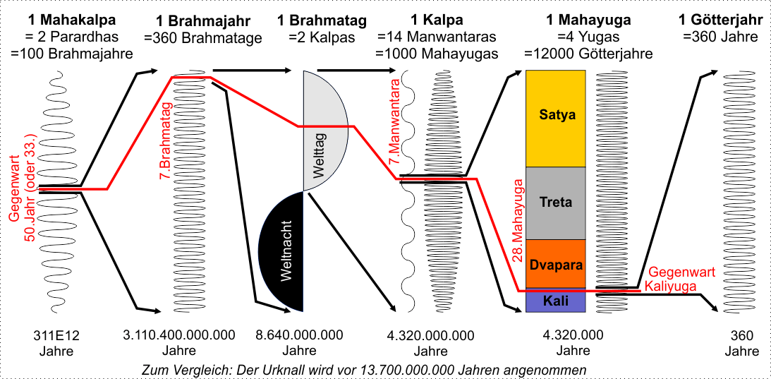 So hört von mir, was man als Parardha und Para bezeichnet. Die wohlbekannten Zahlen sind 1, 10, 100 und 1.000. Und die Reihe geht weiter mit Ayuta 10.000, Niyuta 100.000, (100000) Prayuda 1.000.000, (1000000) Koti bzw. Crore 10.000.000, (10000000) Arbuda 100.000.000, (100000000) Abja 1.000.000.000, (1000000000) Kharva 10.000.000.000, (10000000000) Nikharva 100.000.000.000, (100000000000) Shanku 1.000.000.000.000, (1000000000000) Samudra 10.000.000.000.000, (10000000000000) Madhya 100.000.000.000.000, (100000000000000) Antya 1.000.000.000.000.000 (1000000000000000) und Parardha 100.000.000.000.000.000 (100000000000000000) (1E17). Die Gelehrten sagen, das Doppelte davon ist das Para (das Höchste bzw. Ganze). Die 100 nennt man Paridridha und die 1.000 Paripadmaka. Daraus entstehen (mit 10 multipliziert) die Zahlen Ayuta, Niyuta, Prayuda, Arbuda, Nirbuda, Kharbuda, Kharva, Nikharva, Shanku, Padma, Samudra, (Antya), Madhyama, Parardha und Para (das paßt nicht ganz zur obigen Liste). In der Berechnung wird daraus eine 18-stellige Zahl. Das sind die Begriffe der Gelehrten. Ein Parardha ist die bisherige Schöpfung im Brahma-Kalpa (bzw. Mahakalpa, dem 100-jährigen Leben von Brahma, von dem 50 Jahre vergangen sind, oder nach Kapitel 1.23 auch 32 Jahre). Die gleiche Zeit (ein Parardha) ist noch übrig, und danach beginnt eine weitere Brahma-Schöpfung (Pratisarga, nach der natürlichen Auflösung ins Ungestaltete). (In den Kommentaren wird oft behauptet, ein Parardha sind die Menschentage von 50 Brahma-Jahren. Aber damit kommt man nur auf ca. die Hälfte von 1E17.) Damit habe ich Para und Parardha erklärt.